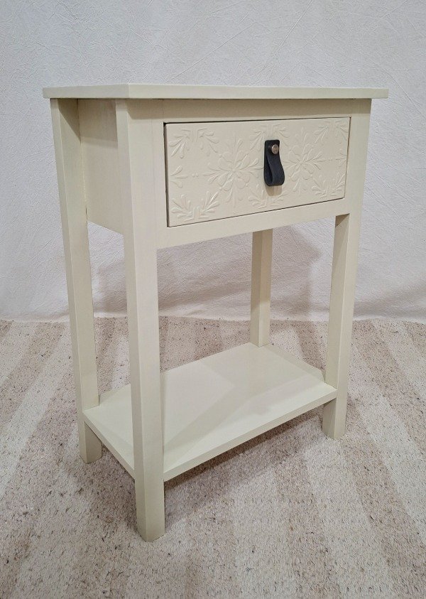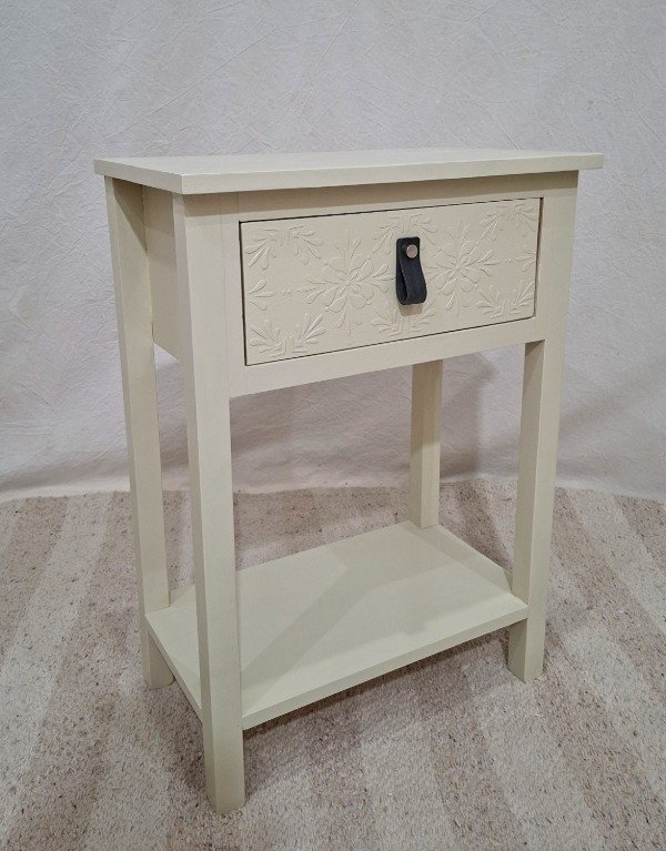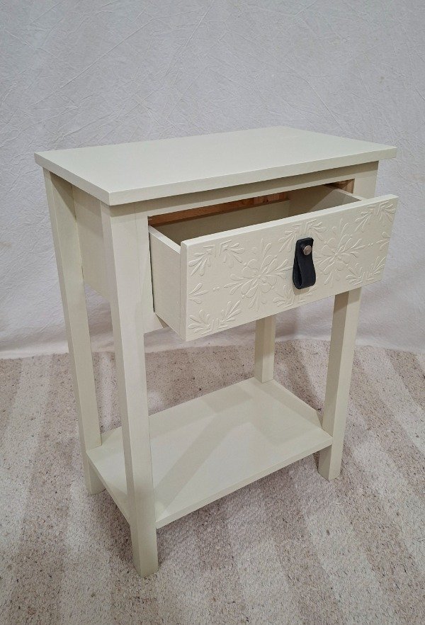 Cajón intervenido con flores en relieve. Se desliza sobre guias de madera.