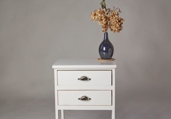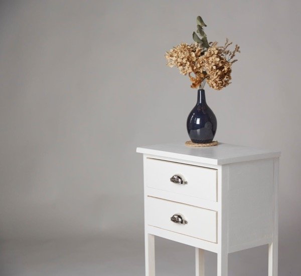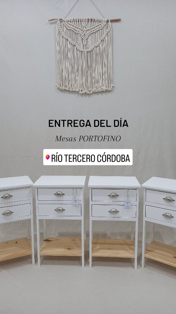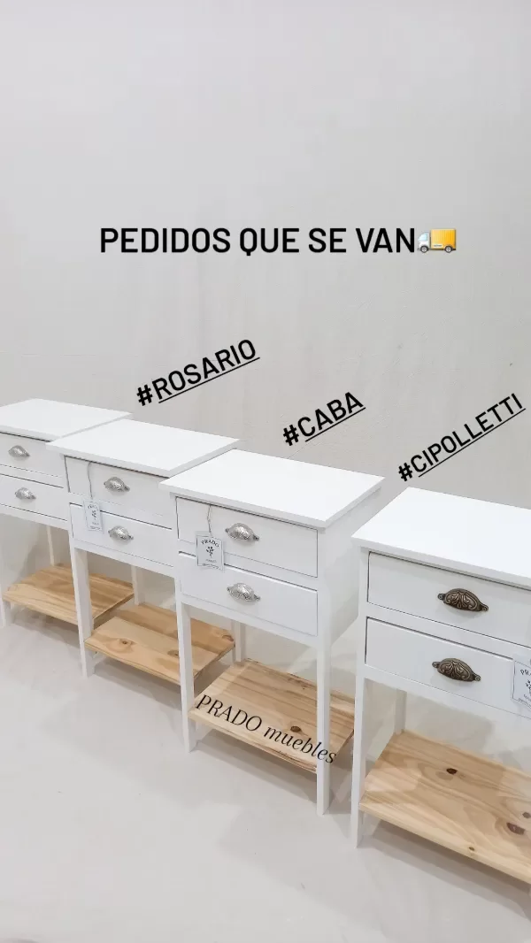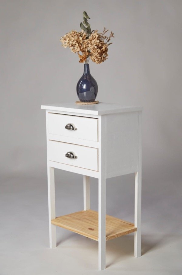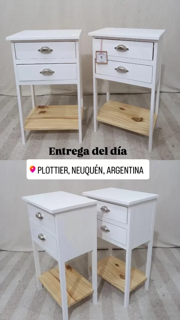 Terminación: esmalte blanco al agua, tapa con protección y brillo de hidrolaca. Barniz incoloro satinado en interior de cajones y en el estante inferior.