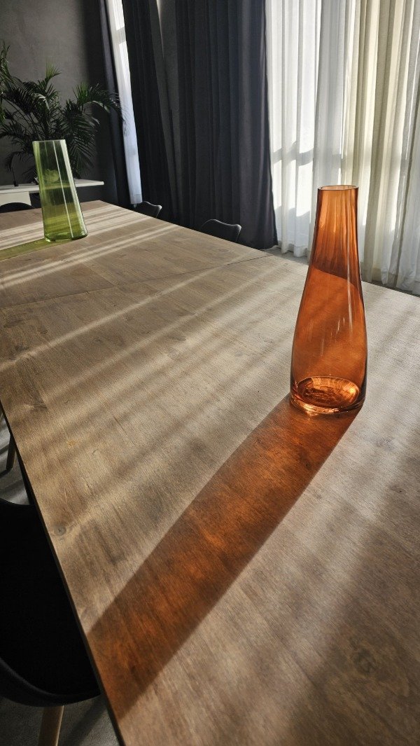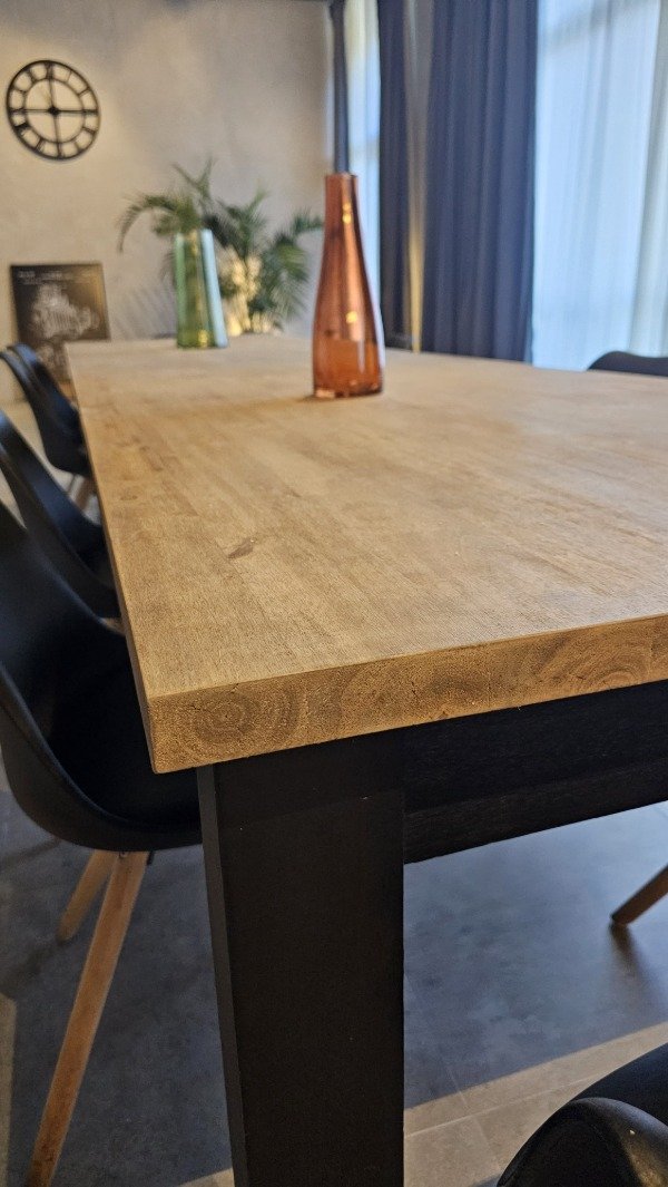 La mesa lleva protección poliuretanica mate transparente marca VARATHANE. Se puede hacer con terminación brillante o satinado también.